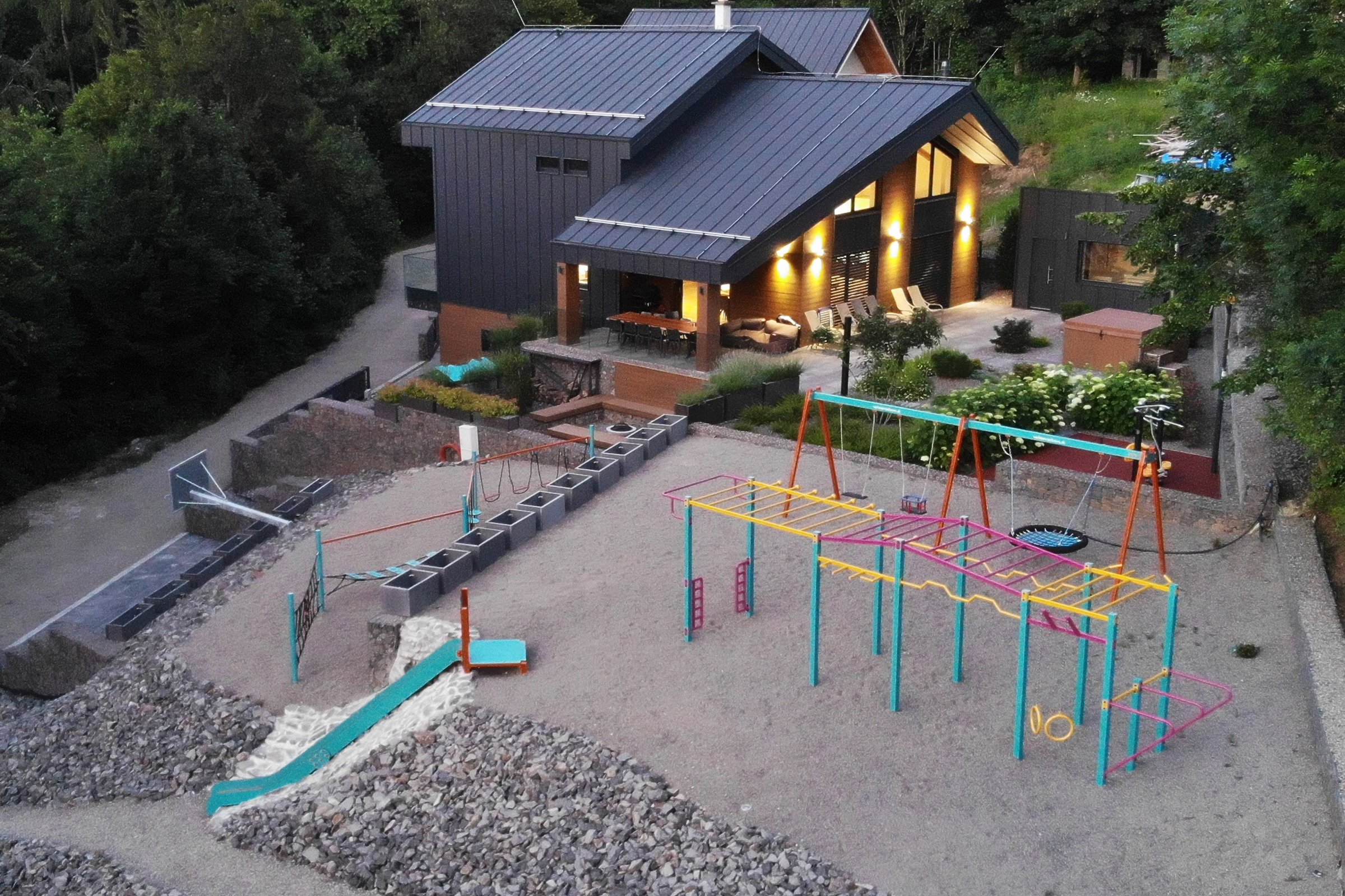 Für Familien ist nicht nur die Ausstattung wichtig, sondern auch die Umgebung. In der Nähe der Villa gibt es eine Wiese und einen sicheren Spielbereich, in dem Kinder sich freier bewegen können, ohne dass Eltern ständig die Logistik organisieren oder nach einem geeigneten Ort zum kurzen „Auspowern“ suchen müssen. Deshalb ist dies eine praktische Familienhütte, wenn Sie während Ihres Aufenthalts Entspannung mit natürlicher Bewegung im Freien kombinieren möchten.